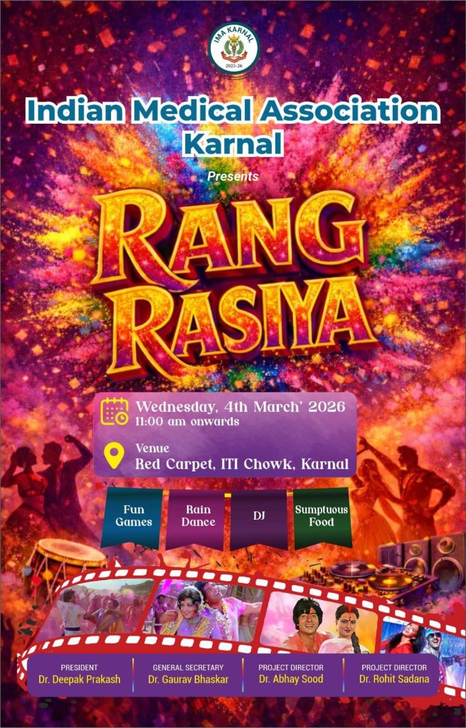 🌈 Rang Rasiya 💦 is a family event celebrating the festival of colors at Red Carpet Lawns, Karnal. Meet and greet your loved ones, enjoy the rain dance, and have a colorful lunch with the IMA family on Wednesday, 4th March 2026.